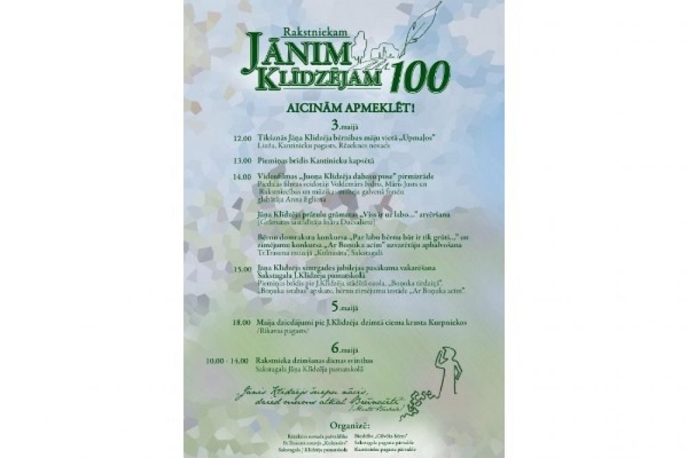 Atceris pasuokumu cikls suoksīs sastdiņ, 3. majā 12.00 Juoņa Klīdzieja bierneibys sātys vītā “Upmaļūs” Kantinīku pogosta Lyužā, sovukuort 13.00 sevkurs interesents byus gaideits iz pīminis breidi Kantinīku kopsātā. Rakstnīka symtgadei veļteitī pasuokumi turpynuosīs Fraņča Trasuna muzejā “Kolnasāta” Sakstagolā, kur nūtiks Klīdzieja pruotulu gruomotys “Viss ir uz labo…” atvieršona (gruomotys sastateituoja Ināra Ducsaliete), kai ari bārnu dūmrokstu konkursa “Par labu bērnu būt ir tik grūti…” i zeimiejumu konkursa “Ar Boņuka acīm” uzvarietuoju apbolvuošona.