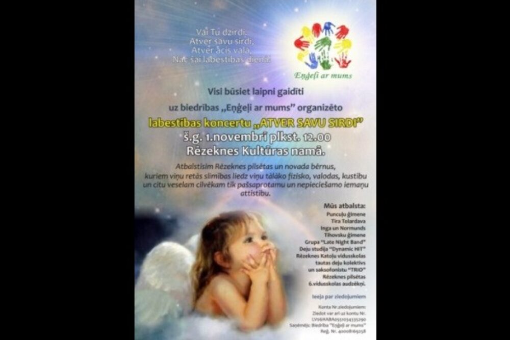 1. novembrī 12 stuņdēs Rēzeknis kulturys nomā (Bruoļu Skryndu īlā 3) bīdreiba “Eņģeļi ar mums” īlyudz iz labesteibys koncertu “Atver savu sirdi”, aicynojūt ar īīšonys zīduojumim atbaļsteit Rēzeknis piļsātys i nūvoda bārnus ar eipašom vajadzeibom, informej Rēzeknis Kulturys i Turisma centra puorstuove Maija Upeniece.