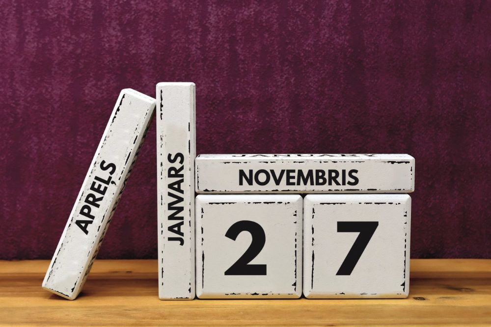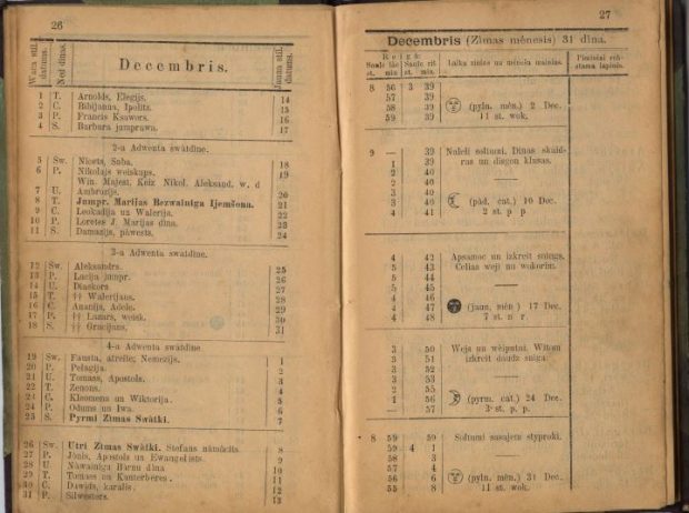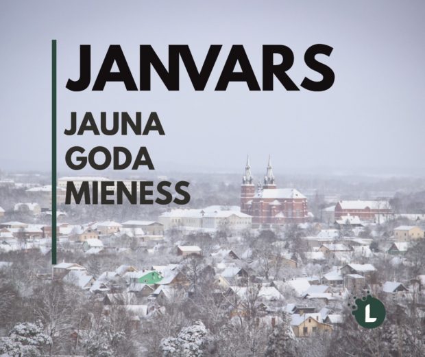 Mienešu nūsaukumus myusu dīnuos latgaliski roksta: janvars, februars, marts, apreļs, majs, juņs, juļs, augusts, septembris, oktobris, novembris, decembris.