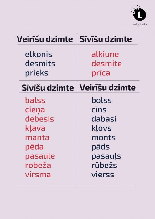 Storp obejom latvīšu volūdys tradicejom ir vēļ kaida interesanta atškireiba – vairuoku vuordu dzimtis nav taidys pošys. Pīmāram, latvīšu literaruos volūdys vuords “pasaule” ir sīvīšu dzimtī, bet latgalīšu “pasauļs” veirīšu, voi ari vuords “prieks” ir veirīšu dzimtē, bet “prīca” – sīvīšu.