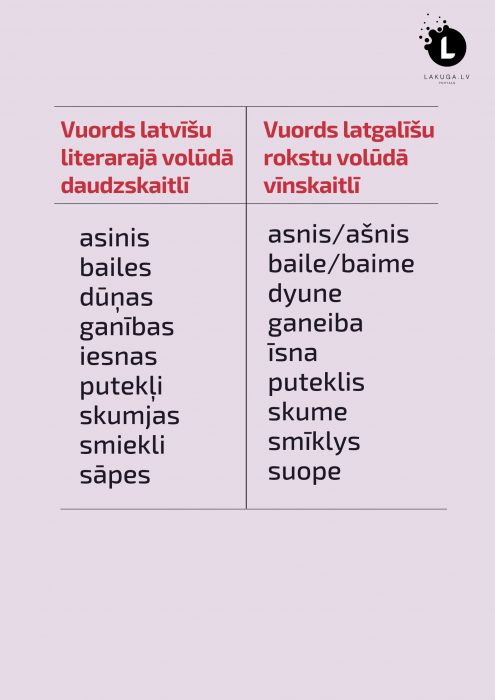6. Latvīšu literarajā volūdā vuordi daudzskaitlī, latgaliski – vīnskaitlī