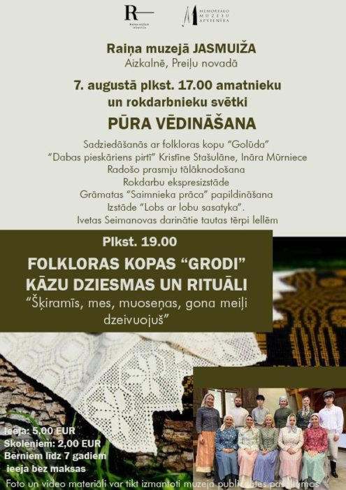 7. augustā Raiņa muzejs “Jasmuiža” aicynoj iz rodūši skaneigu svātdīnis vokoru, kur 17.00 stuņdēs suoksīs amatnīku i rūkdarbnīku svātki “Pūra vēdināšana” ar folklorys kūpu “Golūda” i “Grodi” pīsadaleišonu, informej muzeja puorstuovi.