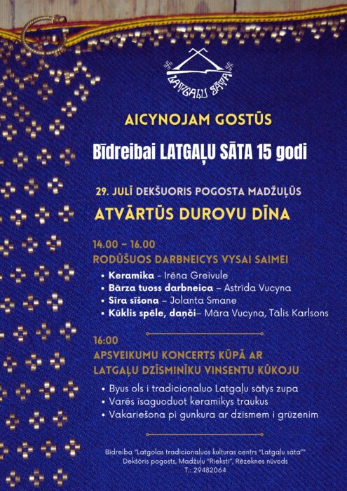 29. julī Rēzeknis nūvoda Dekšuoru pogosta “Madžuļūs” Latgolys tradicionaluos kulturys centrs aba bīdreiba “Latgaļu sāta” svieteis 15 godu jubileju. Dīnys parādā paradzātys rodūšuos darbneicys vysai saimei, dzīsminīka Vinsenta Kūkuoja koncerts i cyti puorsteigumi, viestej bīdreibys puorstuovi.
