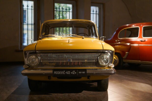 Īmūt tuoļuok iz padūmu laiku ekspoziceju, Raitis stuosta: “Te ir moskviču sekceja. Itys mums nu Rēzeknis sovā gaitā atrypuoja. Kod jis te tyka nūlykts, tam pat vēļ beja dereiga tehniskuo apskate. Ir ari jaunuoki moskviču modeli. Cyta storpā, itys ir unikals, partū ka tam iz sēdekļu atstuotys originaluos plēvis nu ryupneicys. Eipašnīks ar mašynu ir nūbraucs tik pīcys tyukstūšys kilometru. Sovpus itys, kaiba nikas eipašs, vys tys ir duorguokais moskvičs itamā ekspozicejā, deļtam, ka tys ir eksporta modeļs, atsaškir ar tū, ka iz paneļa informaceja ir angliski i aizmugurē uzroksts “Moskvich”.