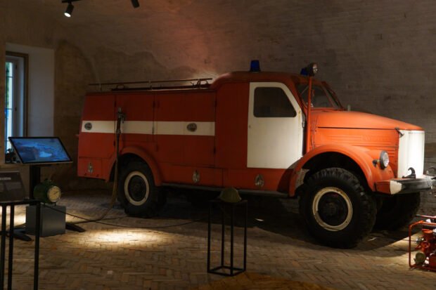“Te, pīmāram, ir uotruos paleidzeibys mašynu ekspoziceja. Ite radzama mašyna nu Amerikys. Tok, ka atsasaukt taišni iz piļsātys viesturi, ite var apsavērt humanitaruos paleidzeibys mašynu nu Dānejis, taidys Daugovpilei tyka paduovynuotys vairuokys. Itei mašyna cīši patyka vysim darbinīkim, pasasokūt tuos jaudai, lobom spiejom izbraukt vysaidūs apstuokļūs, taipoš ari deļtam, ka itamā mašynā varēja stuovēt gondreiž pylnā augumā, PSRS ražuotyos mašynys beja daudzi zamuokys i naārtuokys,” stuosta Raitis Kikusts.