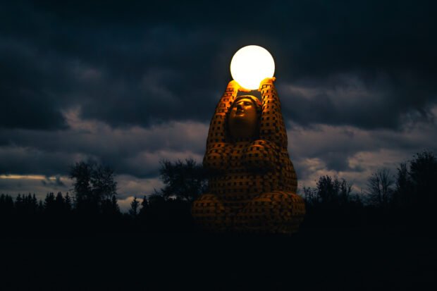 Obejis skuļpturys ir vaira nakai pīcus metrus augstys. Sīvīšu figūrys rūkuos tur izgaismuotu elementu, kas simbolizej Mieneša gaismu i ceļu caur tymsu, kas vad iz sātu. Ideja par Oduma meitokm dabuota nu senejis Odumovys azara teikys, kas stuosta par muosom, kurys paleidziejušys bruoļam nanūblūdeit plošajā pasaulī, laimi meklejūt.