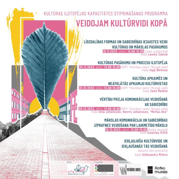 Maņ ruodīs, ka vidi i vītu sev apleik mes veidojam kotrys pats, deļtuo grybu aicynuot īdzeivuotuojus aktivuok īsasaisteit kūpīnu taiseituos nūtikšonuos. Ka ite ir vēļ kaids, kuram ryup vide i apleik nūteikūšais, tod 1. decembrī aicynoju iz bīdreibys “Cita Daugavpils” seminaru “Kultūra apkaimēs un neatklātās apkaimju kultūrvietas”, kas byus 1. decembrī Daugovpilī, Vīneibys noma Mozajā zālē.