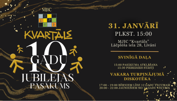 Trešdiņ, 31. janvarī, Leivuonā nūtiks MJIC “Kvartāls” 10 godu jubilejis koncerts. Jaunuotnis iniciativu centrā jius sagaideis jaunīšu prīšknasumi, pīredzis stosti, vysaidys aktivitatis, kai arī dzierīni i aizkūdys. Leivuons vysa goda garumā puorsteigs jaunīšus ar vysaidom nūtikšonom, jo itymā godā tei ir jaunīšu golvyspiļsāta, sekoj leidza i apmeklej!