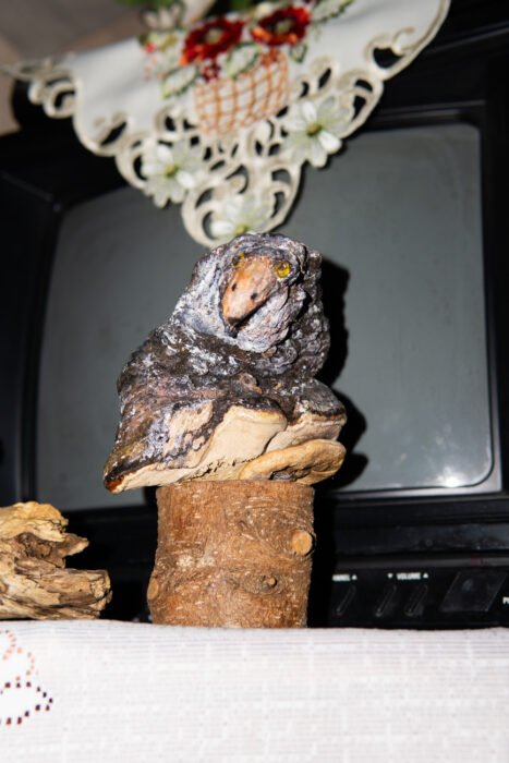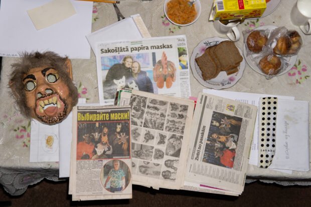 “Tys nav dorbs tik par leimiešonu, tī ir vajadzeigs ari spāks, kab izgrīztu, izskruopātu ar nazi smolkuos vītenis, izlīkumus, kas ir lels spīdīņs taišni iz rūkom. Maskys nav viņ kruosuotys, tok ari papyldynuotys ar nu lynu veiduotim motim, vylnu, “ stuosta masku meistare.
