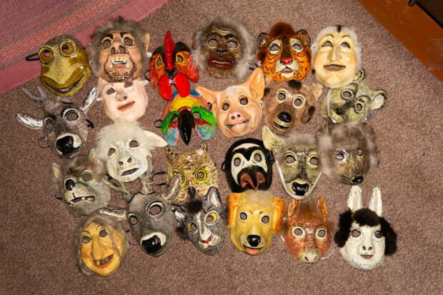 Maskys ir taiseitys autentiskajā, godu symtu senejā papjemaše tehnikā, kur golvonais izejmaterials ir papeirs. Tūlaik, 90. godūs, nabeja taidu leimu, kai ir niu. Jevgenija vysus godus, kod veiduojuse maskys, leimi taisejuse poša – iudinī tyka vuoreiti mylti.