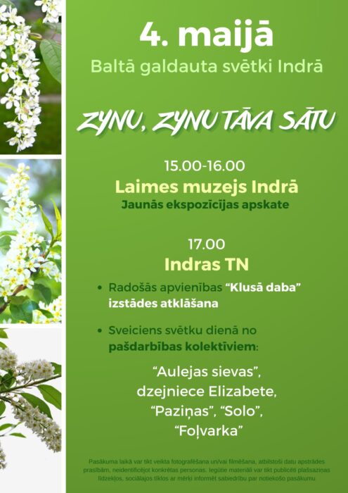 Kruoslovys nūvoda Indrā 4. majā tiks svieteiti Boltuo goldauta svātki, kuru laikā varēs apsavērt jaunū Indrys Laimis muzeja ekspoziceju. Pasuokums turpynuosīs Indrys tautys nomā, kur atkluos rodūšuos apvīneibys “Klusā daba” izstuodi, kai ari uzastuos “Aulejis sīvys”, dzejneica Elizabete i pošdarbeibys kolektivi “Paziņas”, “Solo” i “Foļvarka”.