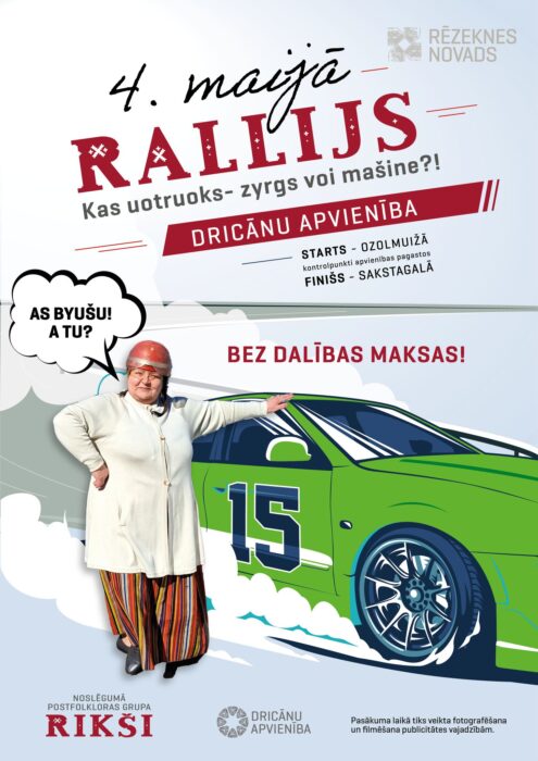 Naīrostu vaļsts svātku svieteišonys veidu itūgod izalasejuse Rēzeknis nūvoda Drycānu apvīneiba. Tī 4. majā varēs pīsadaleit rallijā “Kas uotruoks – zyrgs voi mašine?!”. Rallija starts byus pi Ūzulmuižys kulturys noma, finišs – Sakstagolā, bet kontrolpunkti – Untumūs, Strūžānūs, Drycānūs, Gaigalovā, Nagļūs, Rykovā i Kantinīkūs. Suokt braucīni var sevkurā kontrolpunktā i tam der kotrys motorizāts transporta leidzeklis, kam ir vysi vajadzeigī dokumenti. Pyrma tuo tik juoizdūmoj, voi gribi byut “zyrgs” voi “mašine” – “zyrgi” pretendej iz kū nibejs vīnkuoršu, bet ar patīsu interesi grib paraudzeit sovus spākus i sajimt daleibys bolvys, cikom “mašinis” jau pretendej iz golvonajom bolvom.