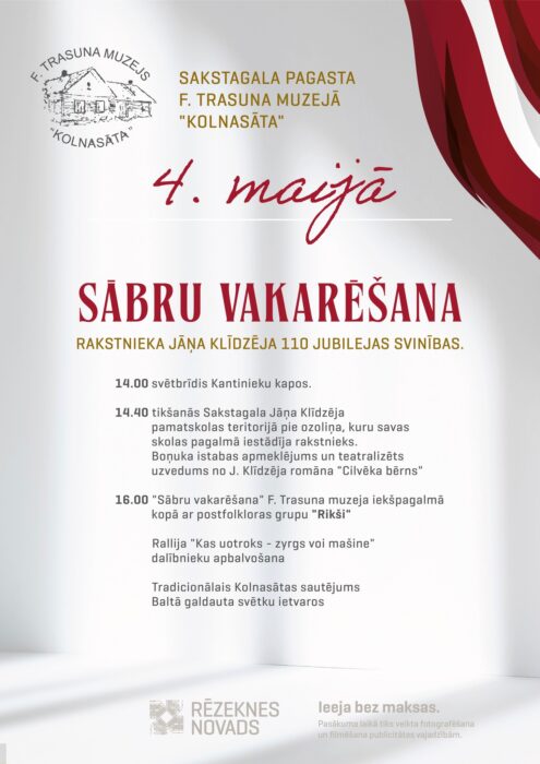 6. majā atguoduosim rakstnīku Juoni Klīdzieju juo 110. jubilejā. Rēzeknis nūvodā juo pīminis pasuokumi aizasuoks 4. majā ar svātbreidi Kantinīku kopūs, kam sekuos sasatikšona Sakstagolā Juoņa Klīdzieja pamatškolys teritorejā pi ūzuleņa, kū statejs pats literats. Tī varēs apmeklēt ari Boņuku ustobu i pīdzeivuot teatralizātu izvadumu nu romana “Cilvēka bērns”. Tyvojūtīs vokoram, Fraņča Trasuna muzeja “Kolnasāta” pogolmā suoksīs “Sābru vakariešona” kūpā ar postfolklorys grupu “Rikši”. Tuos laikā apbolvuos ari īprīšk rokstā pīmynātuo rallija uzvarātuojus.