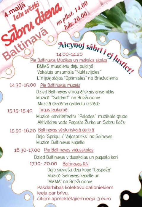 Bolvu nūvoda Baļtinovā itūgod 4. majs tiks svieteits ar īlu svātkim – Sābru dīnu. Nu 14.00 da 20.00 stuņžu vairuokuos Baļtinovys vītuos muzicēs Baļtinovys pošdarbeibys kolektivi kūpā ar sābrim nu Brīžucīma i Saļņovys. Taipat Baļtinovys muzejā byus apsaverama goldautu izstuode.