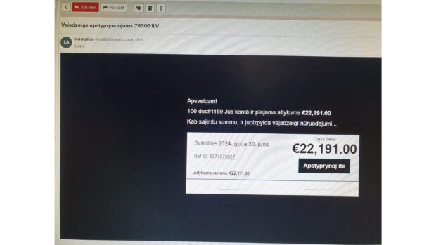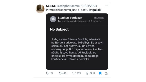 Ka runuot par kaidom pyrmajom lītom, 2024. godu varātu raudzeit īzeimēt kai pyrmuo spama voi pikšeriešonys (e-posta viests, kas sataiseitys tai, lai ruodeitūs, ka syuta oficialys īstuodis, tok mierkis ir izmuoneit naudys) latgaliski laiku. Janvarī Tviterī (voi platformā X – kai puorsaukta niu) lītuotuojs @eriophorummm publicieja viesti, ka pyrmū reizi sajiems spamu latgaliski – kaids advokats Stivens Bordols (kurs viestulis golā palyka par Bordoku) sasazynuoja par nazkaida dr. Edvina montuojumu. Kaida ir ituos viestulis volūdys kvalitate – nav augsta, bet reizē varātu saceit, ka lobuoka nakai piļneiga suocieja i latgalīšu volūdys nazynuotuoja raksteišona.