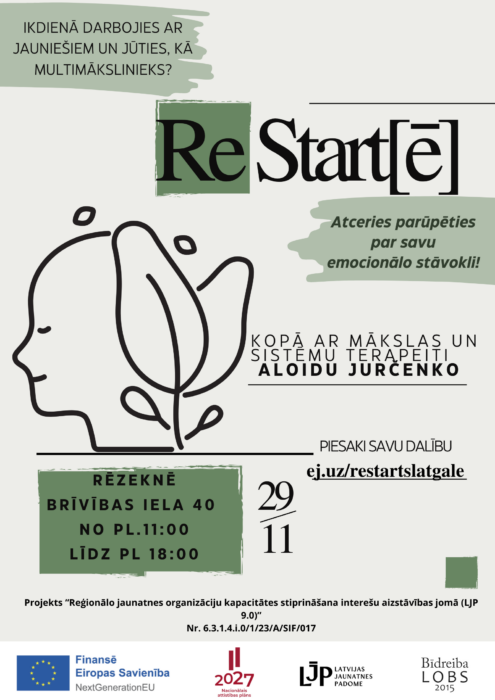 Kab nūstyprynuotu dorbā ar jaunuotni struodojūšūs psihoemocionalū stuovūkli i aizsorguotu pret izdegšonys riskim, Latvejis Jaunuotnis padūmis Latgolys viestnīceiba organizej pasuokumu “ReStarts”, kurā aicynoj pīsadaleit sevkuru jaunuotnis specialistu, lai praktizātu tehnikys i maklātu atbiļdis iz vaicuojumim kūpā ar muokslys i sistemu terapeiti Aloidu Jurčenko. Pasuokums nūtiks 29. novembrī Rēzeknē, Breiveibys īlā 40, nu 11 stuņžu reitā da 18 stuņdem vokorā.