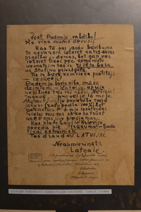 Kara muzeja ekspozicejā radzami vairuoki pretuošonuos grupu uzsaukumi, kas pīraksteiti taišni Latgolā. Vīns nu taidu teik datāts ar 1940. gods rudini, tū parakstejuse “neapmierinātā Latgale”. 1941. gods majā uzsaukuma autori Česlavs i Vladislavs Erdmani Škaunis pusē tyka arestāti. Jūs kriminallītā kai pīruodejums ari beja sasaglobuojuse itei uzsaukuma lapeņa. Sūpluok tam ekspozicejā radzams ari Kuorsovys vydsškolys školānu raksteits uzsaukums, kur jī aicynoj paturēt svātā vuordā Latveju i tuos himnu i nūruoda, ka okupaceja nabyus myužeiga. Ari itys uzsaukums paraksteits daudzskaitlī – ar vuordu “latvieši”.