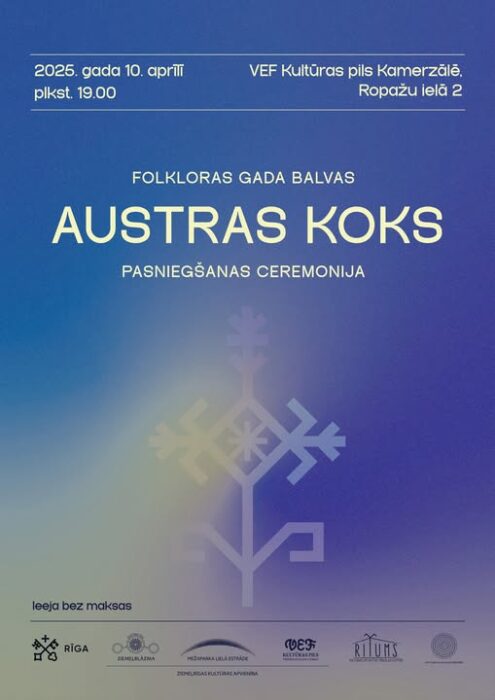 Folklorys bolvys “Austras koks” sajiemiejus gūdynuos 10. aprelī septeņuos stuņdēs vokora VEF Kulturys piļs Kamerzālē Reigā, īīšona ceremonejā ir bez moksys.