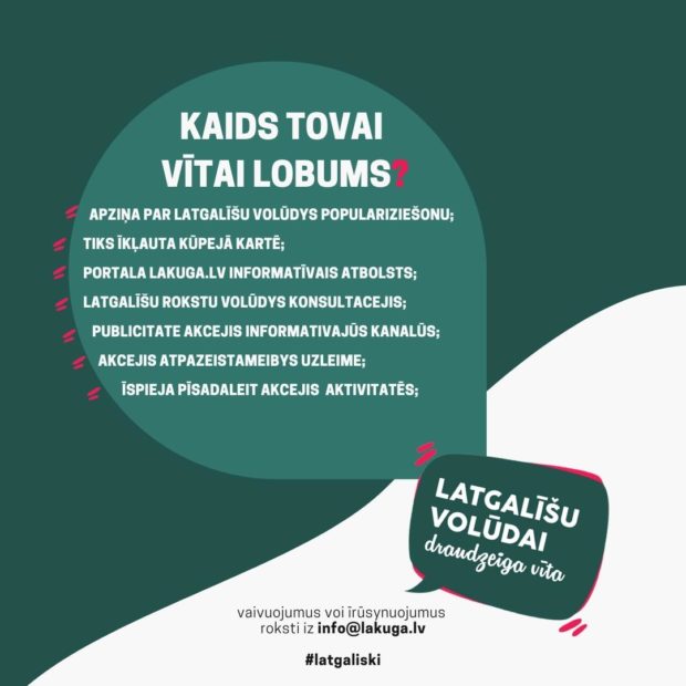 Gūds, slave i lela pateiceiba! Pīsadaleišona akcejā ir breivpruoteiga i ar tū kotrys dalinīks pauž atbolstu latgalīšu volūdai. Akcejis reikuotuoji dalinīkim pīduovoj papyldu publicitatis īspiejis – īkļaušonu akcejis kartē (ar aprokstu i biļdem), publicitati bīdreibys “LgSC” i portala lakuga.lv socialajūs teiklūs (Facebook, Instagram, Twitter i TikTok), stuostūt sabīdreibai par vītom Latgolā, Latvejā i cytur pasaulī, kuruos var dzierdēt, redzēt voi kai cytaiž pīdzeivuot latgalīšu volūdu, kai ari īspieju pīsadaleit akcejis eipašajuos aktivitatēs (spēlē, akcejis ceļvedī i cytuos).