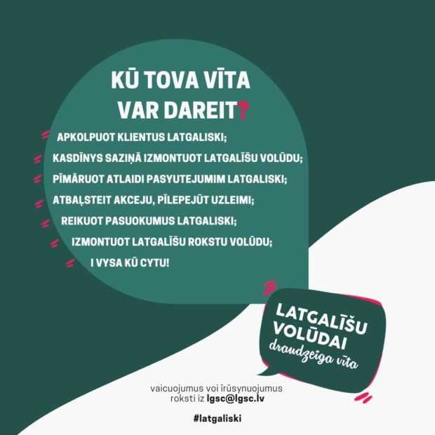 Juobyut draudzeigim latgalīšu volūdai! Tys var izapaust kai īspieja ar klientim sasarunuot latgaliski, latgaliskys produkcejis, suveniru, pakolpuojumu pīduovuošona, eipašys akcejis klientim, kurī sasazynoj latgaliski, latgalisku pasuokumu reikuošona, saziņa sovā vydā latgaliski, raksteišona latgaliski publicitatis materialūs i teiklūs i cyti veidi, kas akcejis dalinīkam var īīt pruotā.