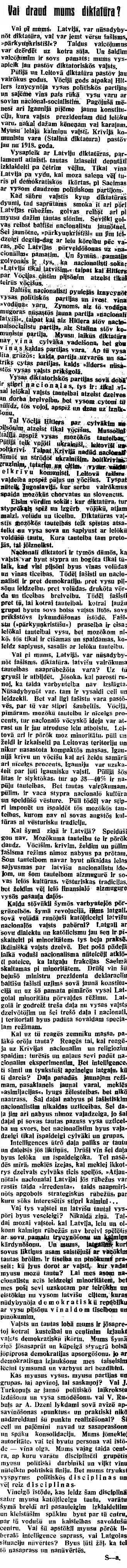 Roksts “Voi draud mums diktatūra?” publiceits 1934. goda 7. martā, puors mienešu pyrms Ulmaņa apvārsuma. Cīši interesns taišni demokratejis i diktaturys, latgalīšu interešu i latvīšu nacionalistu kontekstā. Seviški zynūt tuoļuokū viesturis gaitu, kas samola i latgalīšu kulturu, i Latvejis vaļstiskumu.