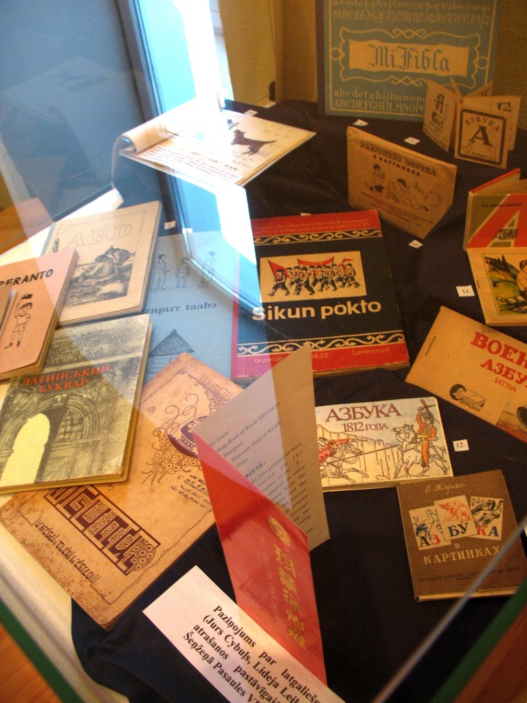 Izstuodē apsaveramys vairuok kai 400 lementari i plakati ar alfabetim nu vysa pasauļa (Tanzāneja, Panama, Uganda, Zimbabve, Indija, Zvīdreja i. c.) dažaiduos volūduos – latgalīšu i latvīšu, krīvu, angļu, albāņu, čerokī, persīšu, gruzinu i. c., kai ari nadzierdeigajim i naredzeigajim jeb Braila rokstā izdūtī lementari, runojūšys, sanēgiptīšu alfabets iz papirusa i auduma, spāņu alfabets uz sārkūceņu kasteitem, ivrita alfabets iz koka skaiteiklim i.c.