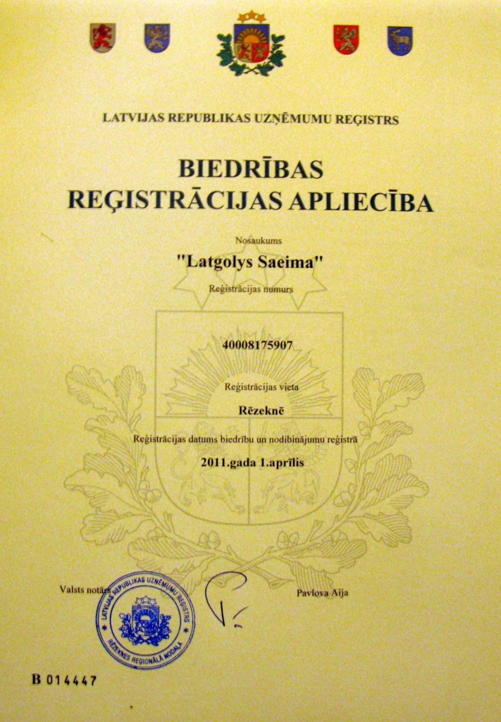 Kod vysleidz latgalisks dokuments natyka pījimts, itū reiz natyka īts puorsyudziešonys ceļš, kas jau tyka dareits pīmynātajā 2009.goda gadīnī, bet tyka īsnīgts attīceigūs dokumentu tulkuojums (ar vaļdes prīšksādātuoja aplīcynuojumu, ka tulkuojums pareizs). Gols golā UR pīkryta itaidam rysynuojumam, deļ tam bīdreiba „Latgolys Saeima” kliust par  juridiskū personu Latvejī, kas pīregistrāta iz dokumentu pamata, kuru vydā ir vīns, originalā sastuodeits latgalīšu volūdā, ar davīnuotu attīceigu tulkuojumu latvīšu literarajā volūdā.