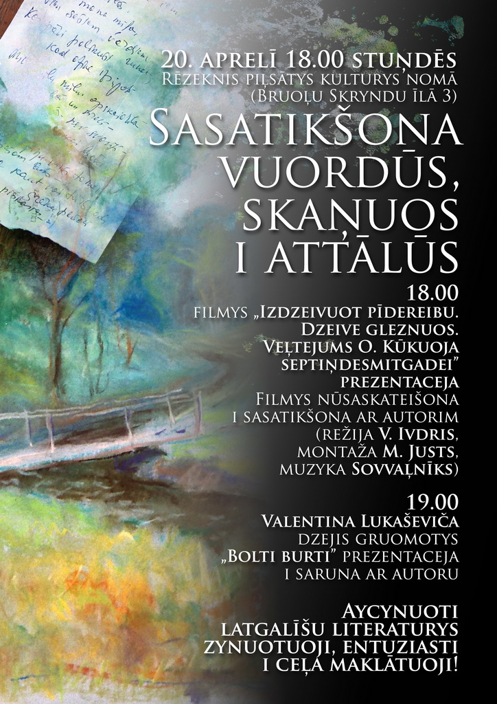 20. aprelī 18.00 stuņdēs Rēzeknis piļsātys kulturys nomā(Bruoļu Skryndu īlā 3) nūtiks divys prezentacejis: dokumentaluos filmys „Izdzeivuot pīdereibu. Dzeive gleznuos. Veļtejums O. Kūkuoja septiņdesmitgadei” (režija V. Ivdris, montaža M. Justs, muzyka Sovvaļnīks) i Valentina Lukaševiča jaunuokuos dzejis gruomotys „Bolti burti”.