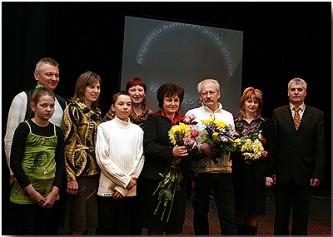Karteņā: Anita Ločmele, Baļtinovys amatierteātra aktieri i režisors Valdis Lūriņš 2011. goda februarī latgalīšu kulturys goda bolvys “Boņuks 2010” apbolvuošonys ceremonejā. Foto “Vaduguns”
