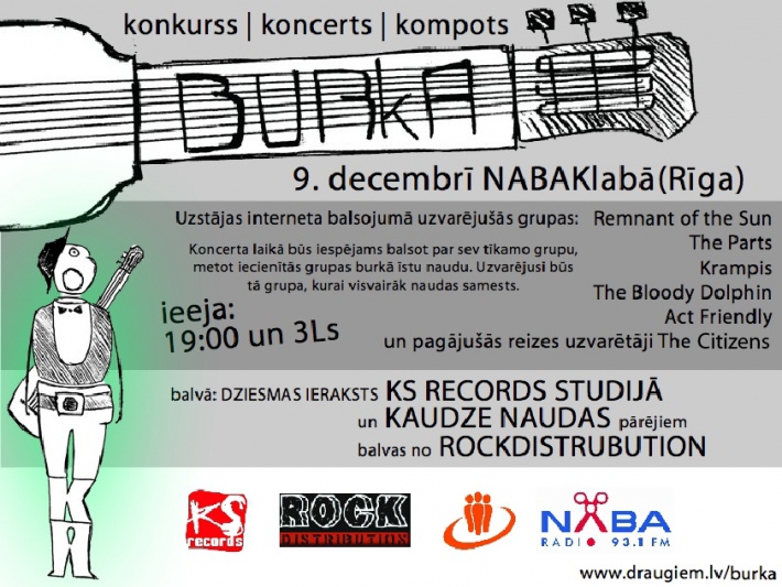 Pyrma laiceņa stuostejom par leivuonīšu grupu KRAMPIS i jūs daleibu i veiksmeim muzykalajūs konkursūs. Tai nu saguojs, ka ar atbaļsteituoju podturiešonu, grupai ir izadevs īkliut konkursa “Burka” finala pīcinīkā i tys zeimoj, ka 9. decembrī KRAMPI vīna vokora ītvorūs vasalys divejis reizes varēs redzēt iz dažaidu Reigys klubu skatuvis: koncertā “Taiseits Latgolā” LMA Studentu Klubā (Raiņa bulvarī 23) i konkursa “Burka” finalā NABAklab (Z.A. Meierovica bulvarī 12).