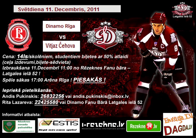 Itymā nedēļā Latgolys fanklubs aicynoj vysus hokeja meiļuotuojus pīsavīnuot komandys atbaļsteituoju pulkam i 11. decembrī viertīs hokeja spēli: Dinamo Rīga – Vitjaz Čehova kluotīnē „Arēnā Rīga”. Deļtuo teik reikuots hokeja kluba Latgolys fanu braucīņs iz Reigu. Izbraukšona 11. decembrī 11:00 nu Rēzeknis Fanu bāra – Latgolys īlā 52.