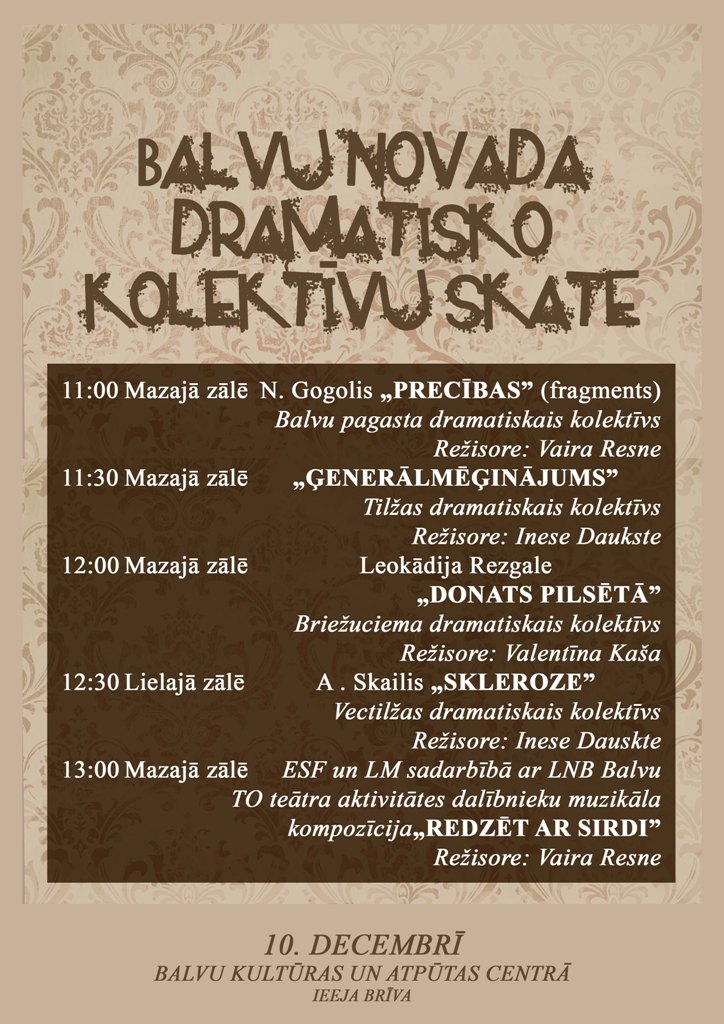 Sastdiņ, 10. decembrī 11:00 Bolvūs nūtyks Bolvu nūvoda dramatiskūs kolektivu skate, kurymā ar sovom izruodem pīsadaleis nūvoda kolektivi nu Bolvim, Bolvu pogosta, Tilžys, Brīžucīma i Vactilžys. Īeja pasuocīni bez moksys.