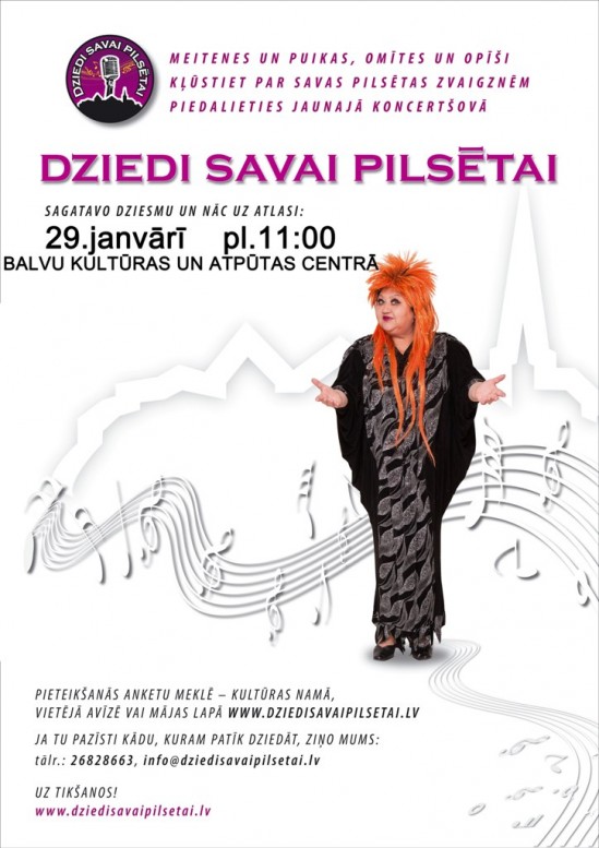 2012. goda janvarī, februarī i martā Latvejis piļsātuos nūtiks jauns, kūšs i puorsteidzūšs koncertšovs “Dzīdi sovai piļsātai”, kurymā pīsadaleit aicynuoti piļsātys i nūvoda īdzeivuotuoji – dzīdūšī školuotuoji, deputati, izjiemieji, pensionari, gaideits byus sevkurs!