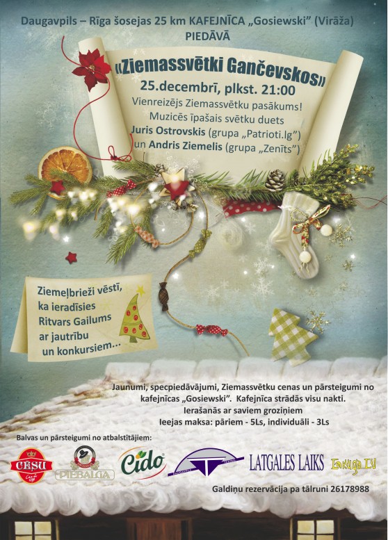 25. decembrī pi seve gostūs iz šosejis Daugpiļs –Reiga 25. kilometru aicynoj kopejneica “Gosiewski”, kur 21:00 nūtyks svātku pasuocīņs “Zīmyssvātki Gančevskūs”.