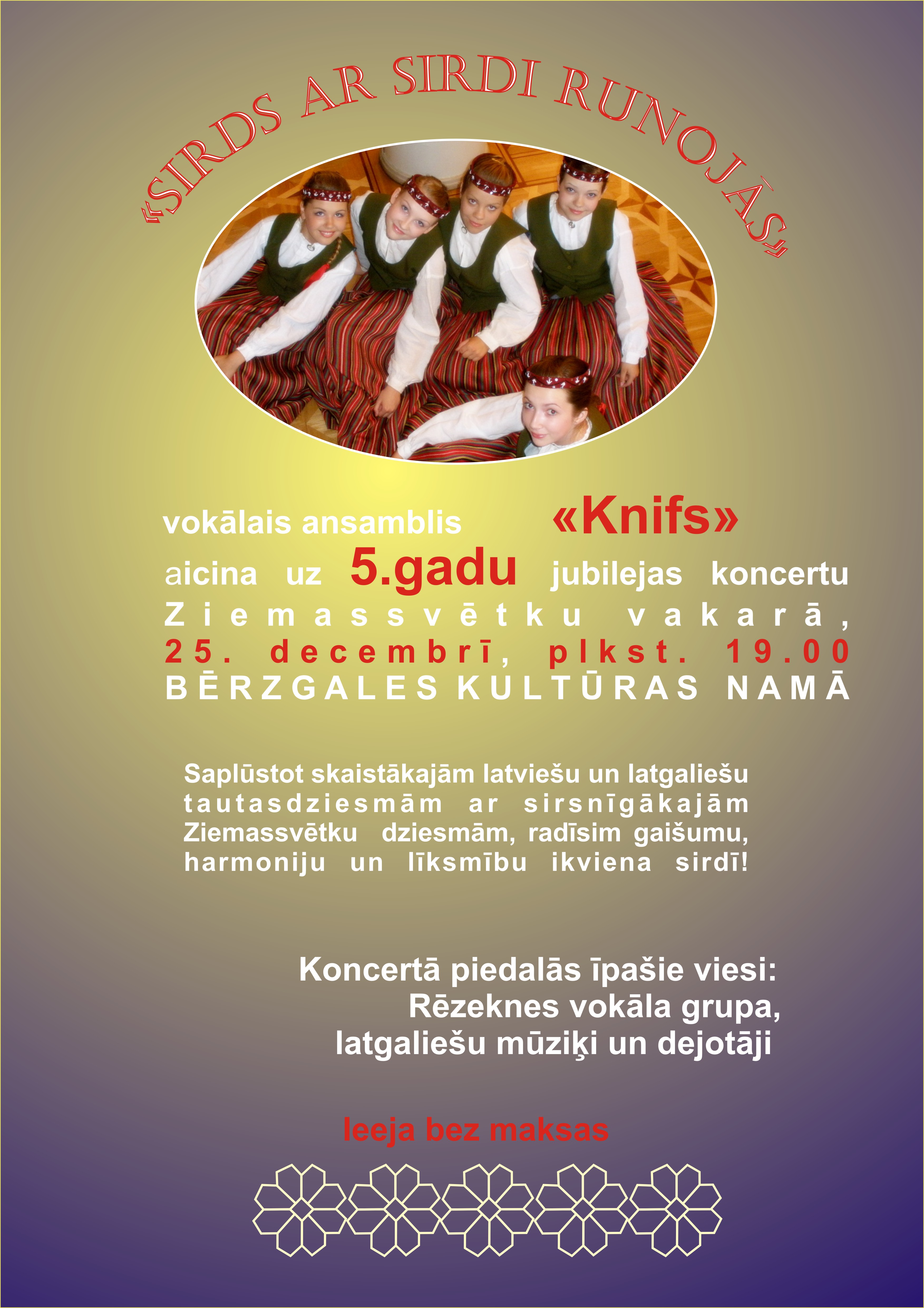 Vokalais ansamblis “Knifs” aicynoj iz 5 godu jubilejis koncertu “Sirds ar sirdi runojās” Zīmyssvātku vokorā 25. decembrī 19 stuņdēs Bieržgaļa kulturys nomā.