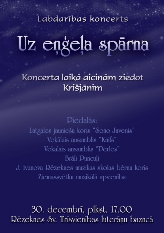 Pīktdiņ 30. decembrī 17 stuņdēs Rēzeknis Sv. Treisvīneibys bazneicā nūtiks Zīmyssvātku lobdareibys koncerts „Iz engeļa spuorna”. Pasuocīni organizej rēzeknīši, kas tyvi saisteiti ar muzyku, kai ari Latgolys muzykalī jaunīši, kas pošu šaļti studej ci struodoj cytuos Latvejis piļsātuos.