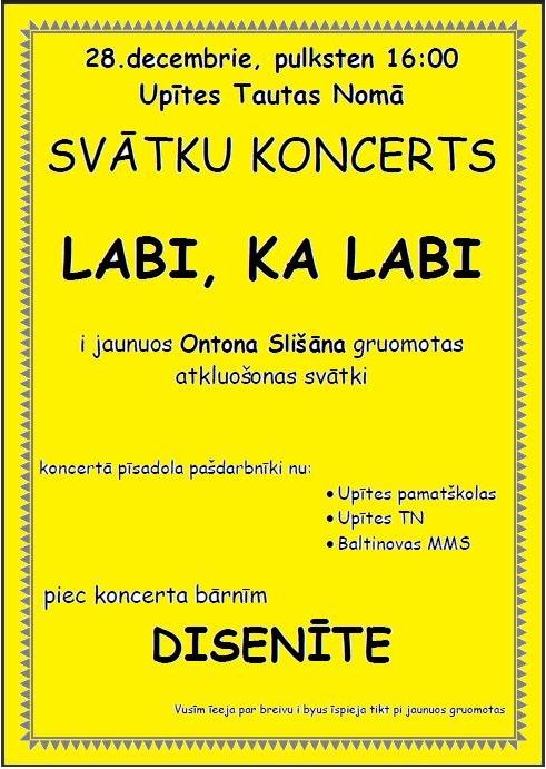 16:00 vysi teik meili gaideiti Vileks nūvoda Upeitis Tautys nomā, kur nūtiks svātku koncerts „Labi, ka labi” i Ontona Slišāna jaunuos gruomotys atkluošonys svātki. Koncertā pīsadaleis pošdarbnīki nu Upeitis pamatškolys, Upeitis Tautys noma i Baļtinovys Muokslys i muzykys školys.