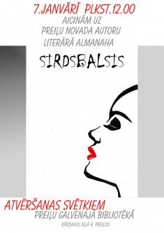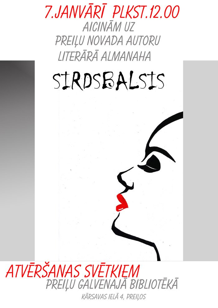 7. janvarī 12 stuņdēs Preiļu Golvonajā bibliotekā nūtiks Preiļu nūvoda jaunūs autoru literaruo almanaha „Sirdsbalsis” attaiseišonys svātki.