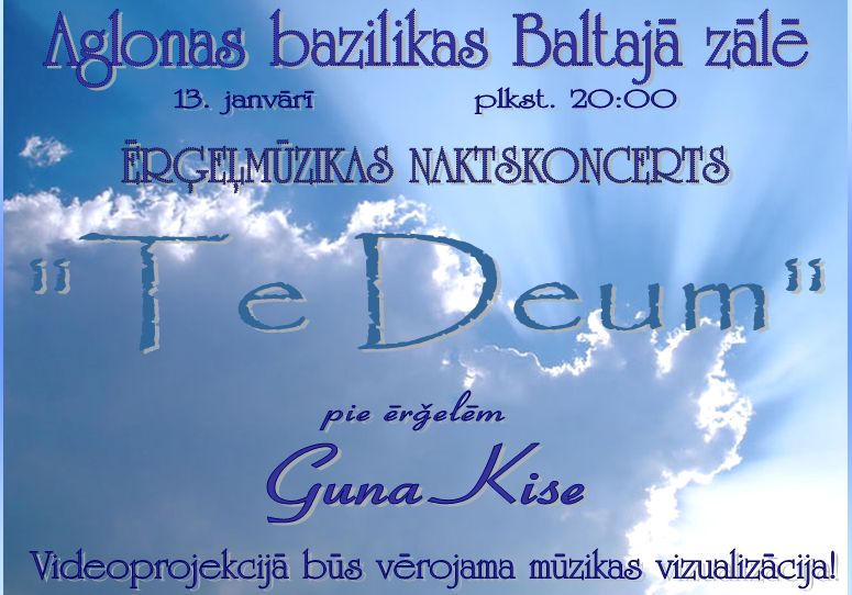 13. janvarī iz Latgolā rešu nūtykumu aicynoj varganiste Guna Kise. 20 stuņdēs Aglyunys bazilikys Boltajā zalā nūtyks vargaņu muzykys naktskoncerts „Te Deum”. Koncerts byus eipašs ari ar tū, ka vysa vargaņu muzyka byus apsaverama – video projekcejuos.