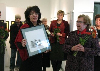 2. Izstuodis „Juoņa Gleizda kruosu pasauļs” atkluošona LKM 2011. goda 23. decembrī – Annele Gleizda izduovynuojuse LKM direktorei Anastasejai Strautai J.Gleizda izohelejis tehnikā taiseituo dorba „Rudiņs I” originalu.
