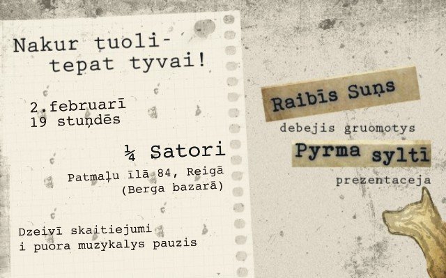 2. februara vokorā ar gruomotys „Pyrma syltī” stuostim Reigā gaisteis Raibīs Suņs. Gruomotys prezentaceja vysim interesentim Reigā nu tyvejuos apleicīnis paradzāta 19:00 ¼ Satori rodūšajā telpā Patmaļu īlā 84, k-2 (Berga bazarā, viertīs kartē zamuok).