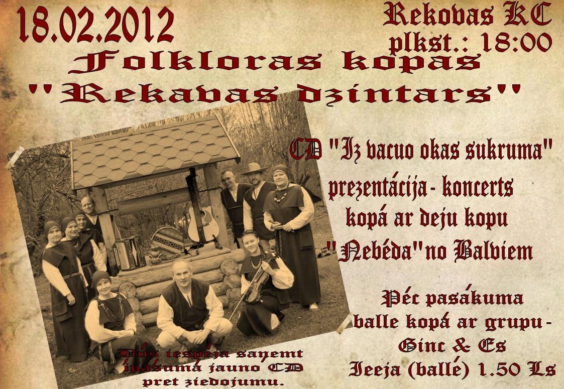 18. februarī 18 stuņdēs Rekovys Kulturys centrā (Viļakys nūvods) nūtiks folklorys kūpys „Rekavas dzintars” muzykys diska „Iz vacuo okas sukruma” prezentacejis koncerts.