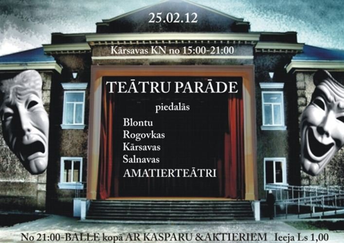 Piec teatru parada 21:30 byus bals kūpā ar Kasparu i akterim. Īejis moksa 1,00 Ls.