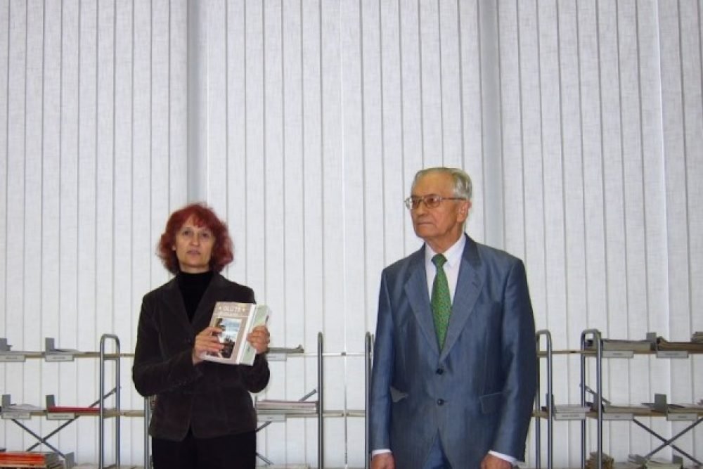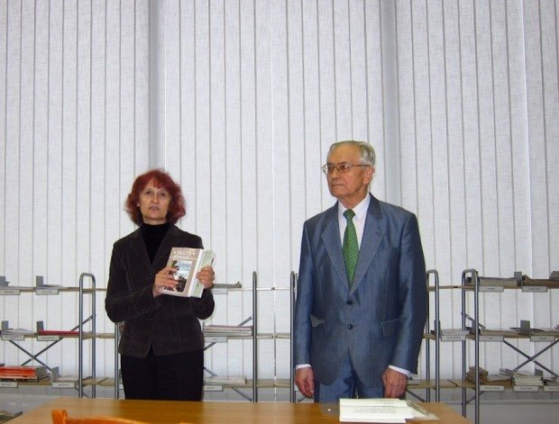 Karteņā – Juoņs Eļksnis i Rēzeknis Centraluos bilbiotekys vadeituoja Marija Sproģe 2011. goda novembrī Tāvu zemis kalendera i Olūta prezentacejā. Foto nu Rēzeknis Centraluos bibliotekys arhiva.