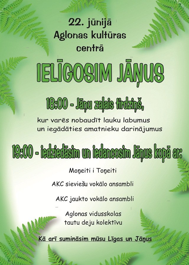 18:00 Aglyunys KC Juoņu īrūtuošonys pasuokums. Juoņu zaļais tierdzeņš, 19:00 Juoņadīnys īdzīduošona i īdoncuošona ar Moneiti i Toneiti, Aglyunys KC sīvīšu vokalū ansambli, Aglyunys KC jauktū vokalū ansambli i Aglyunys vydsškolys tautys dzigu kolektivu.