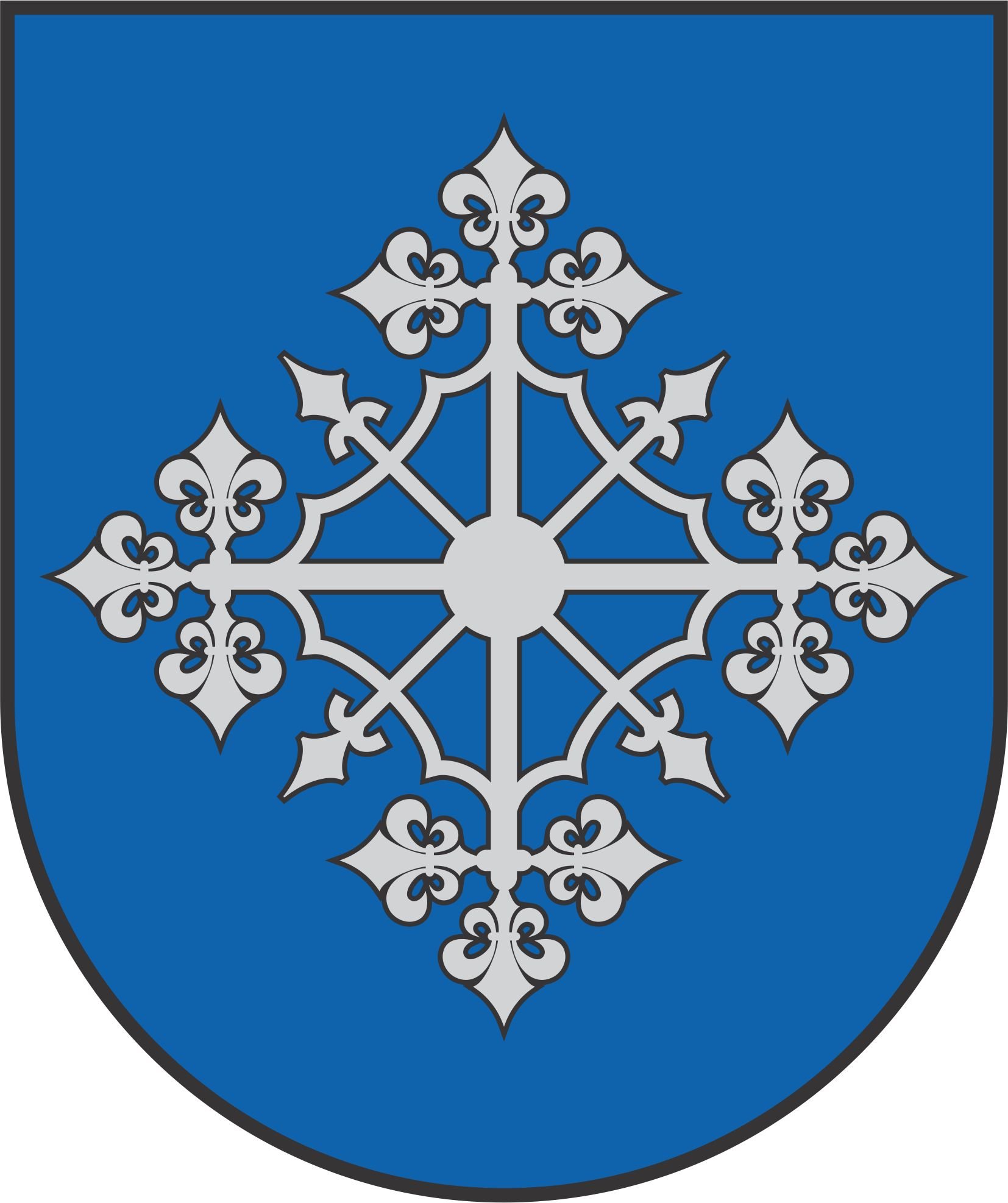 Heraldiskais aproksts: zylā laukā rombveida sudobra trejgolu lilejis krysts, kurais apvīnuots ar škārsu lileju krystu, vyss zam krysta golim rinčveidā savīnuots ar īlīktim pavedīņa elementim.