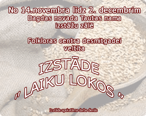 Nu 14. novembra da 2. decembram Dagdys nūvoda Tautys noma izstuožu zalā apsaverama izstuode „Laiku lokos”, ar kuru Dagdys nūvoda folklorys centrs īzeimej sovys pastuoviešonys dasmytū godadīnu.