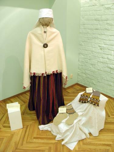 Palāki bryunā (elkšņa myzys) pamatā vertikaluos streipu jūslys. Pamata kruosys jūslys plotums 7,5 – 8 cm, streipu kūpejais plotums 5 cm. Snuotine – pubuļains audaklys. Lyns. 55 x 55 x 166 cm, vydā šyve. Apleik ceļu apauds ar īlūkim, pl. – 3 cm. Piec myusdīnu tradicionaluos kulturys specialistu atzynuma, tautystārpa komplekts ir apsaverams kai augstvierteigs muokslys dorbs ar kūpeju kompoziceju, kurymā ni kruosuos, ni rokstā, ni volkuošonys veidā nikū navajadzātu maineit.
