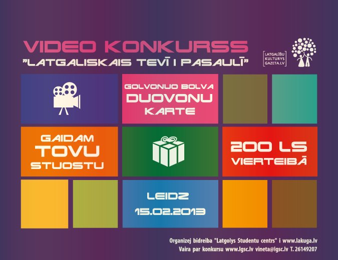 Jaunīšu bīdreiba „Latgolys Studentu centrs” i latgaliski rokstūšais medijs LaKuGa.lv organizej video konkursu „Latgaliskais tevī i pasaulī”, ar kura starpnīceibu aicynoj lauzt sabīdreibys stereotipus par tū, kaidi ir latgalīši, kai cylvāki dzeivoj Latgolā i kurys vierteibys i lītys teik uzskateitys par latgaliskom. Bīži viņ ziņu sižetūs par Latgolu teik ruodeitys sakrytušys sātys, uzsvārta regiona nabadzeiba i atpaliceiba nu puorejuos Latvejis. Latgolys jaunīši aicynoj puorkuopt puori sovim i sabīdreibys prīškstotim i iz Latgolu i latgalīšim pasavērt nu cyta skotu punkta, atkluot jaunys lītys i vierteibys, tū vysu īmyužynuot video i paruodeit ari puorejai Latvejai, kai ari pasauļam.