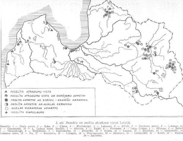 Latvejis akmiņa laikmeta pīminekļu izplateibys karte (piec Graudonis J.,Urtāns V. “Senatnes pēdās”)